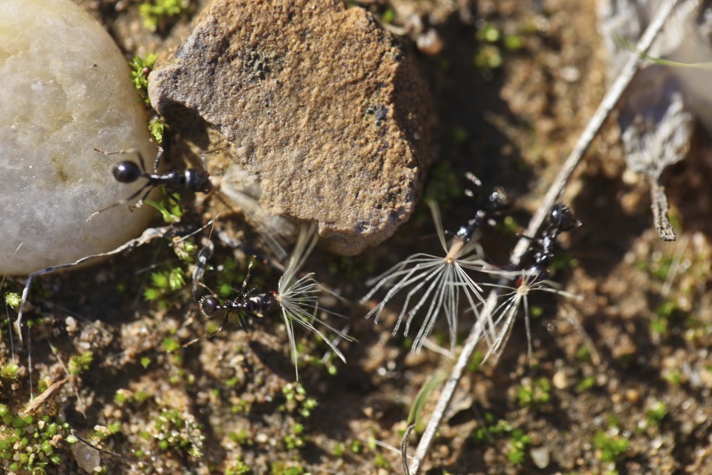 Mais le vent n’est pas le seul à participer à la dissémination de ces graines. Les fourmis profitent de cette manne pour faire des réserves, transportants leur précieux butin sur de longs mètres, à travers les cailloux de la Costière.